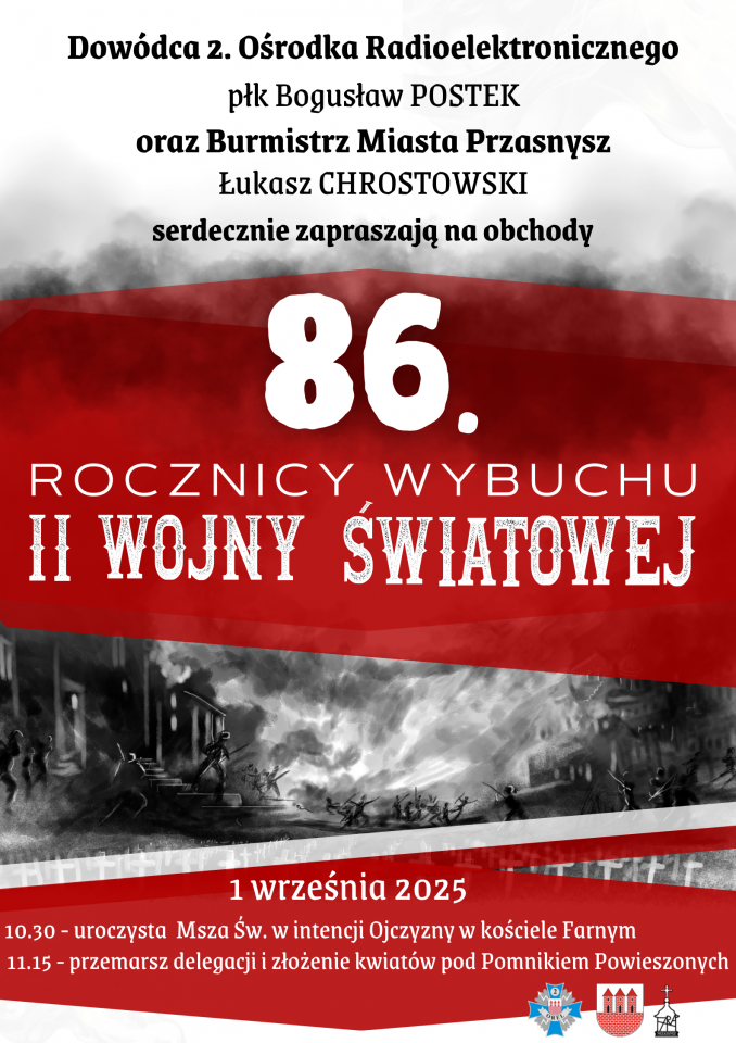 Dowódca 2. Ośrodka Radioelektronicznego płk Bogusław Postek oraz Burmistrz Miasta Przasnysz Łukasz Chrostowski serdecznie zapraszają mieszkańców na uroczystości upamiętniające 86. rocznicę wybuchu II wojny światowej, które odbędą się 1 września 2025 roku (poniedziałek).